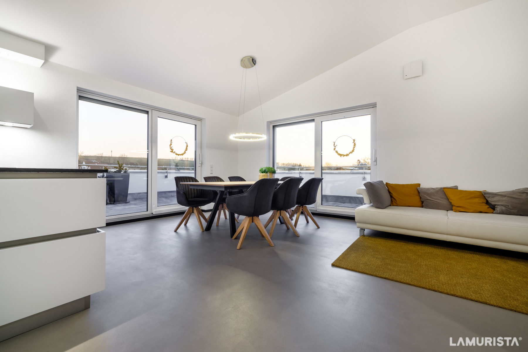 Das Ergebnis sind fugenlose, rutschsichere und pflegeleichte Oberflächen, die in ihrem natürlichen Minimalismus viel Raum für Individualität in Wohnbereichen, Küchen, Bädern und in Ihrem Geschäftsbereich.